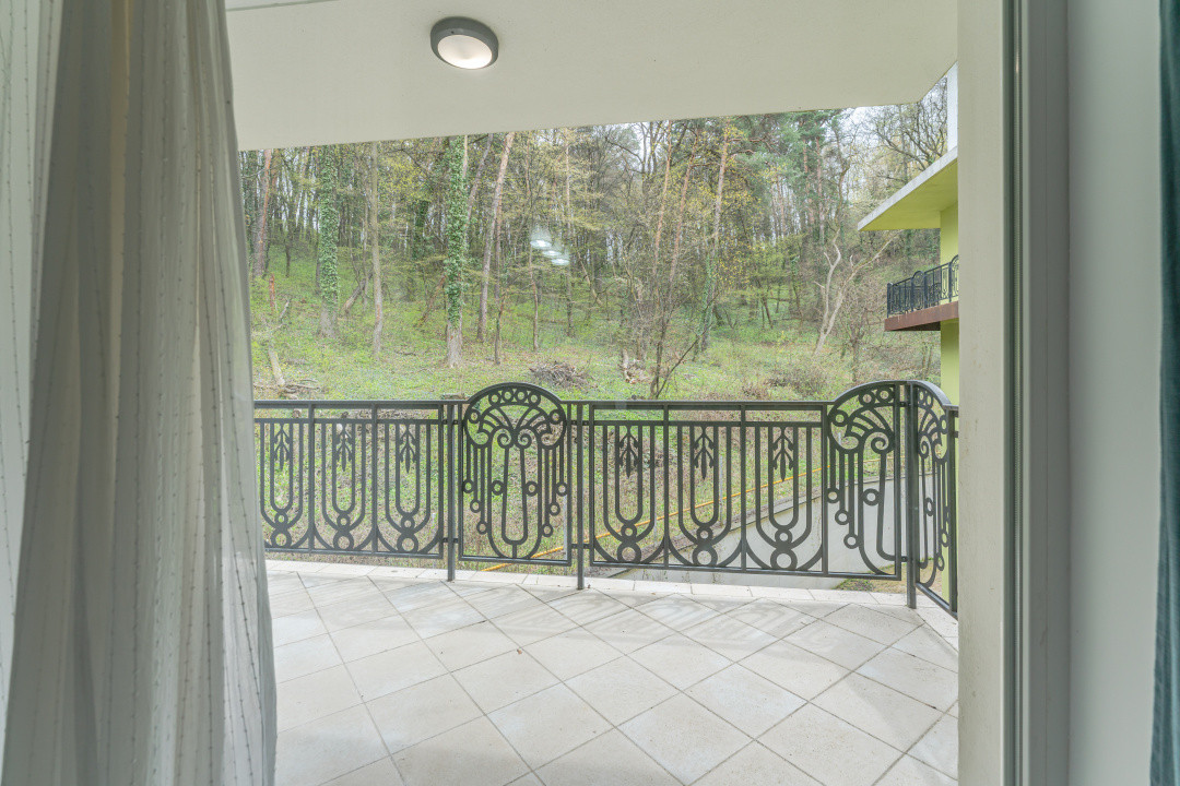Terasa de 6 mp oferă un spațiu intim și relaxant, cu o priveliște superbă spre pădure, ideal pentru a savura cafeaua de dimineață în liniște. Blocul dispune de dotări moderne, inclusiv o stație proprie de dedurizare a apei, asigurând apă filtrată și fără calcar direct la robinet. De asemenea, beneficiază de un lift Schindler de ultimă generație și un sistem de monitorizare video, accesibil în timp real din interiorul apartamentului, pentru un plus de siguranță și confort.
