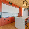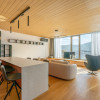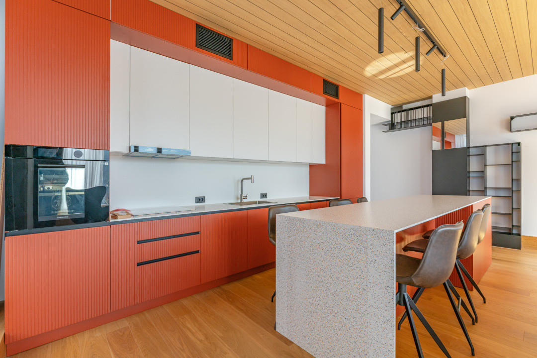 Living spațios cu bucătărie open-space, elegant mobilat;