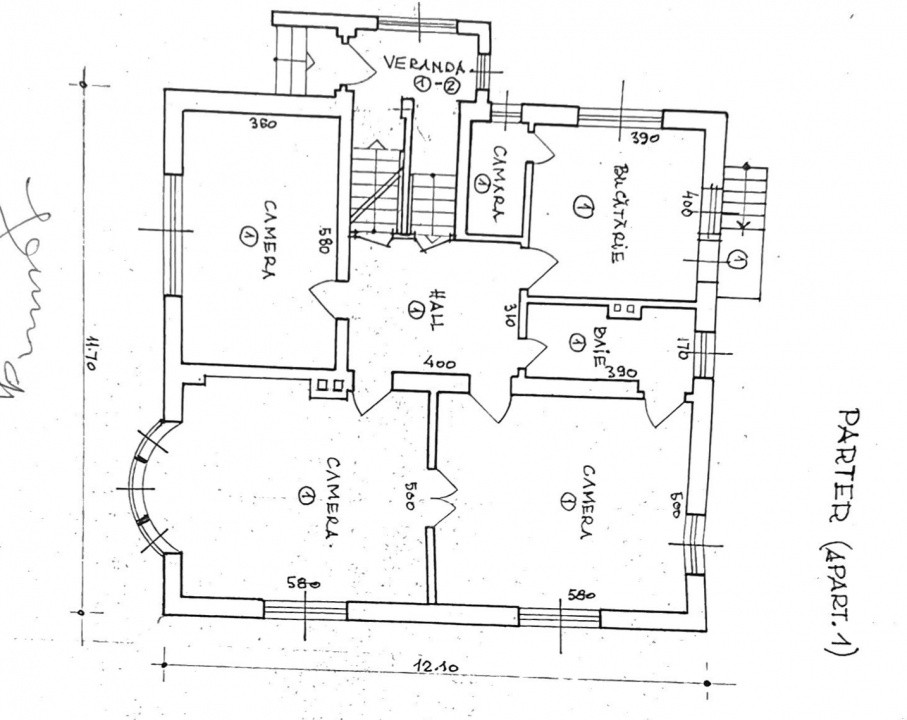 * parter: hol generos, 3 camere, bucatarie, baie, grup sanitar, veranda