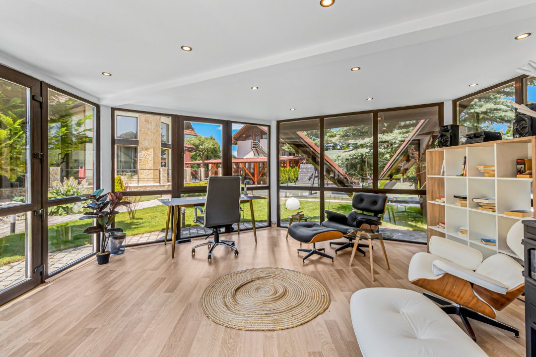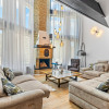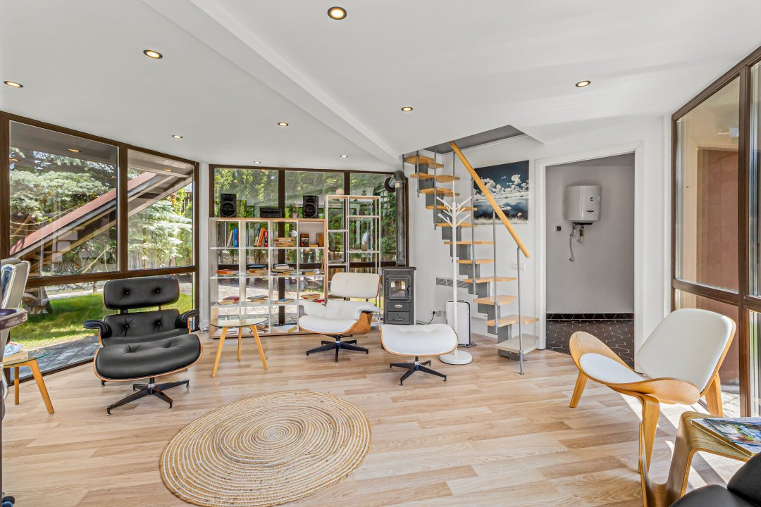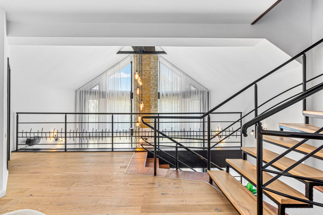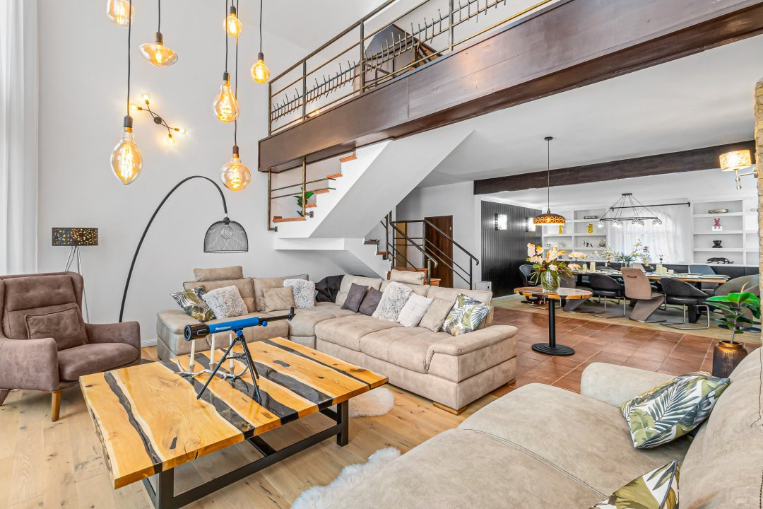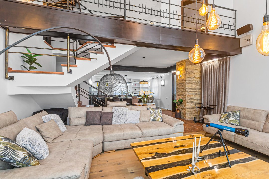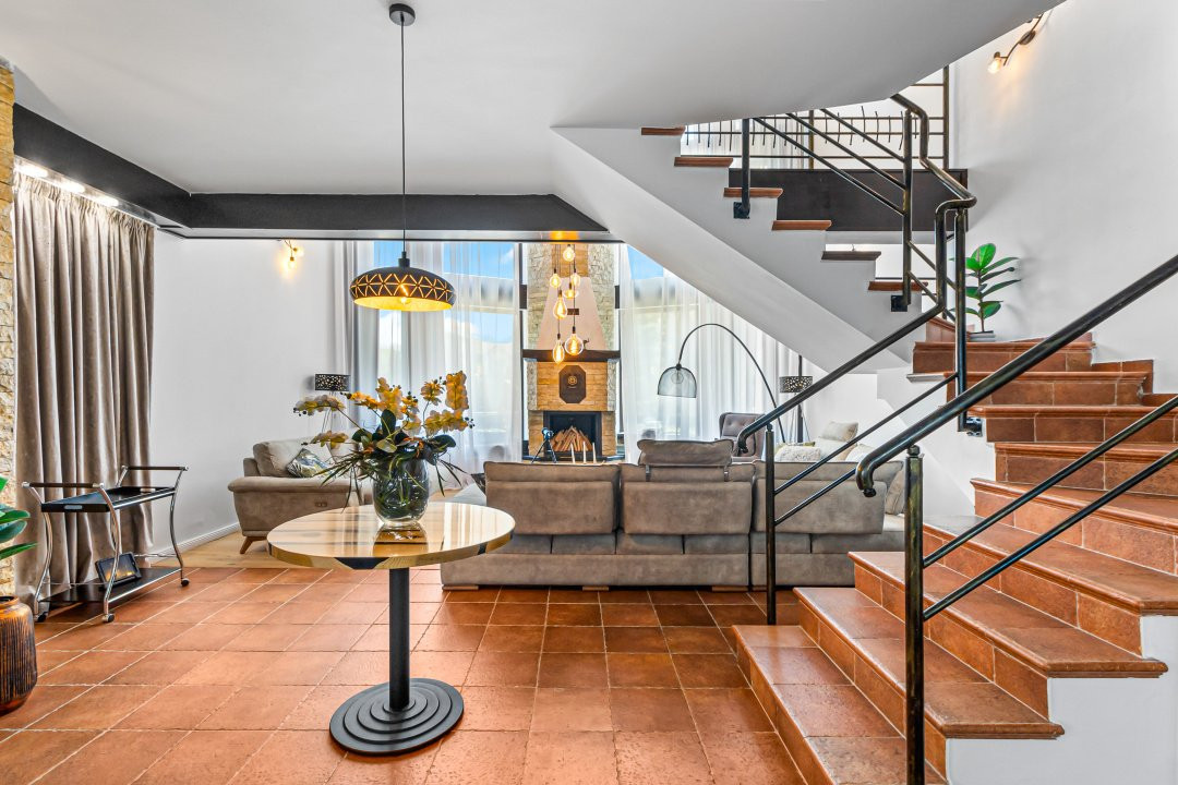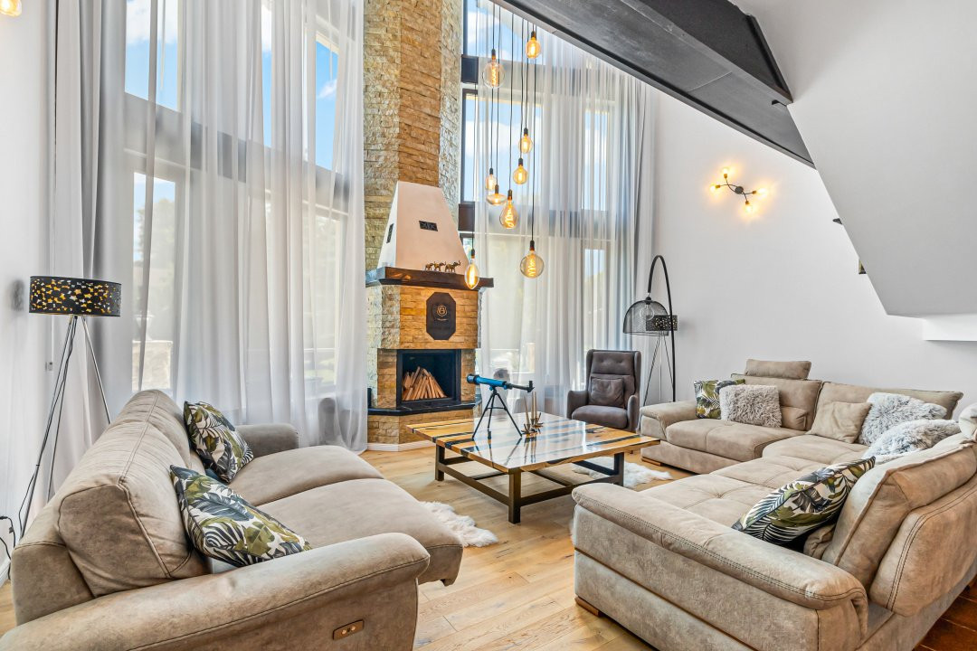 • Living cu tavan înalt de 6,5 metri și șemineu funcțional care încălzește spațiul