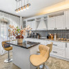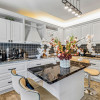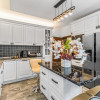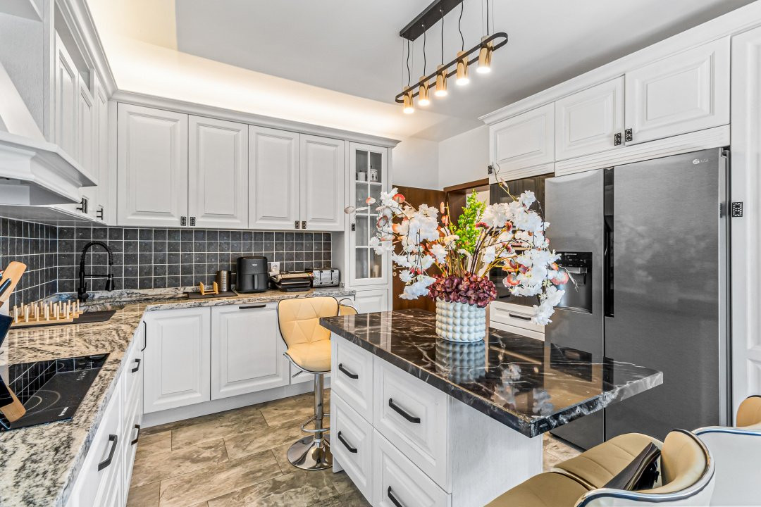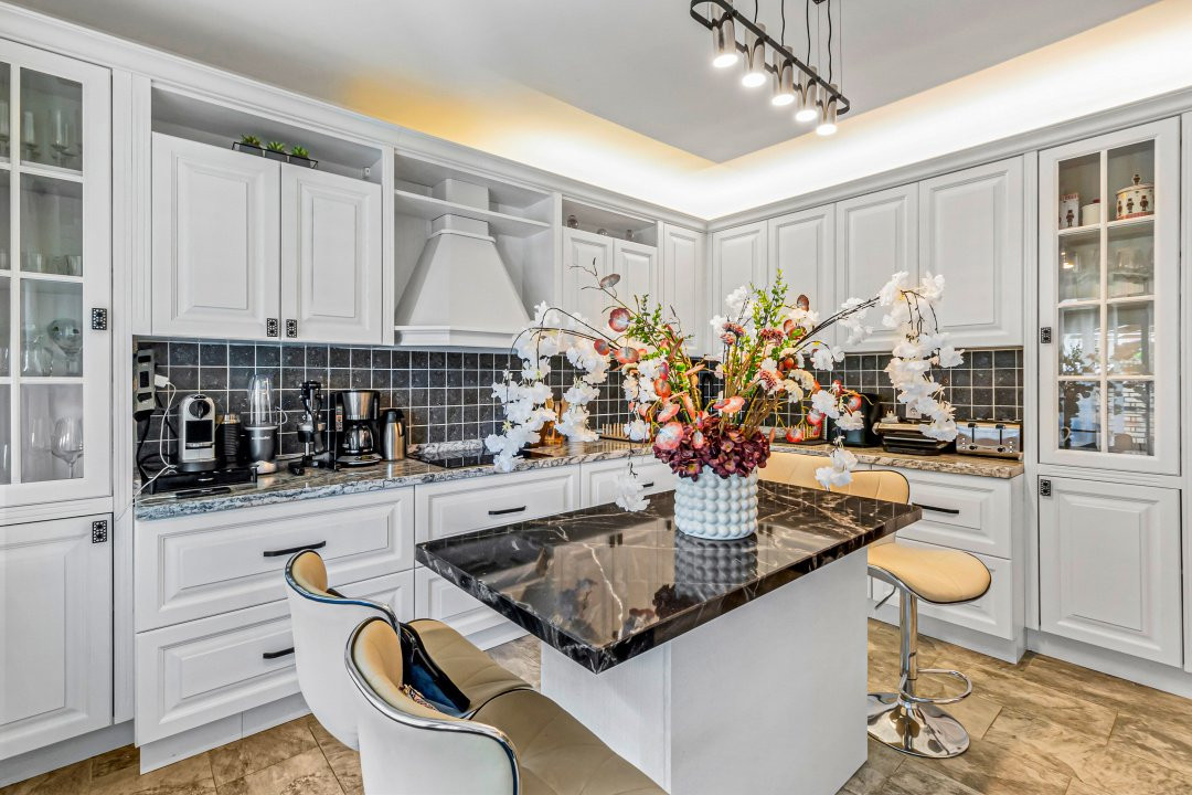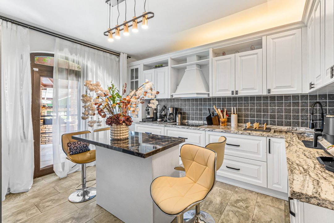 • Bucătărie complet utilată cu mobilier din lemn masiv de stejar, blat marmură, electrocasnice încorporate (inclusiv microunde electric, frigider), dulapuri soft-close