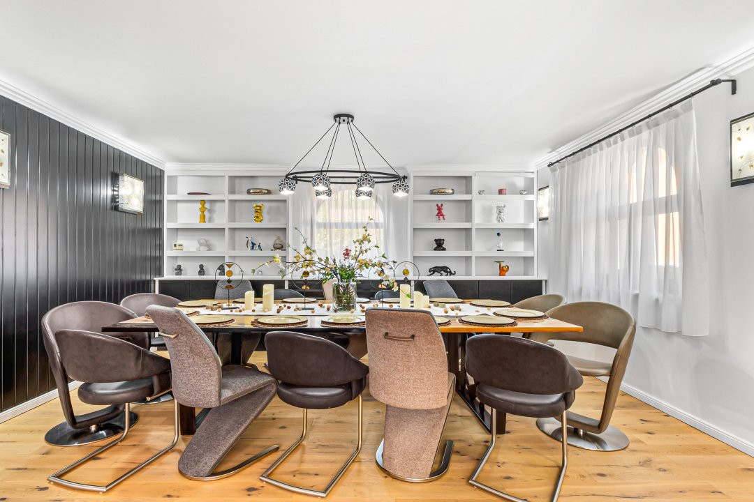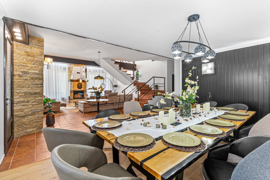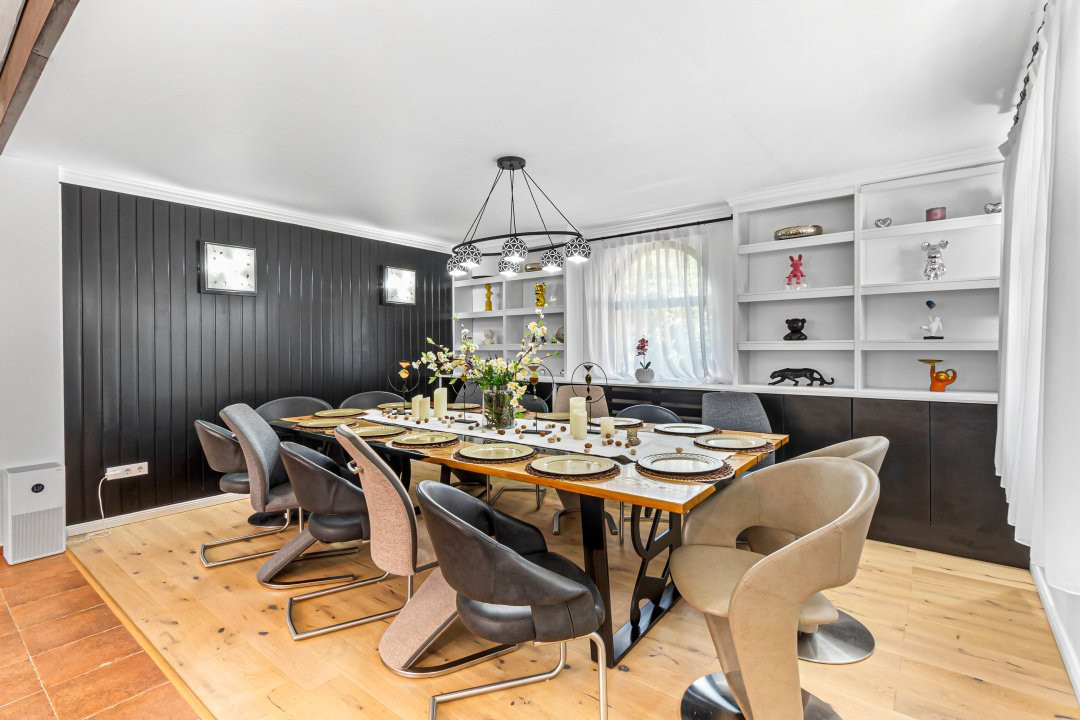 • Zonă de dining cu masă din stejar personalizată pentru 14 persoane, ideală pentru evenimente și cine rafinate