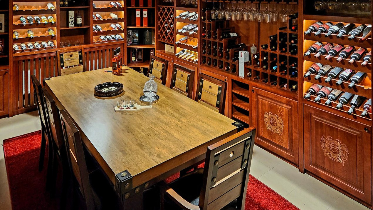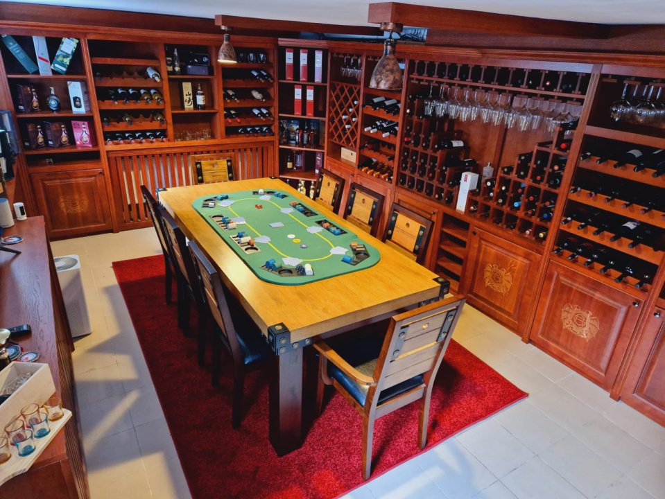 • Cramă cu mobilier din lemn masiv cu frigider pentru vinuri și trabucuri, izolată fonic, chicinetă cu mașină de vase și boiler room