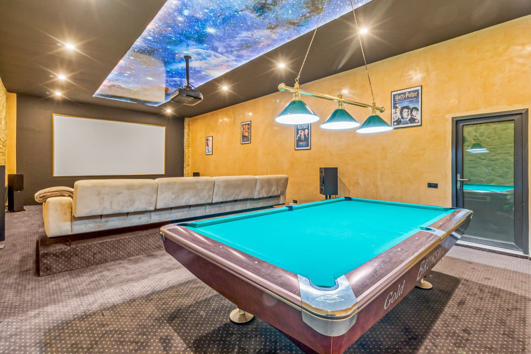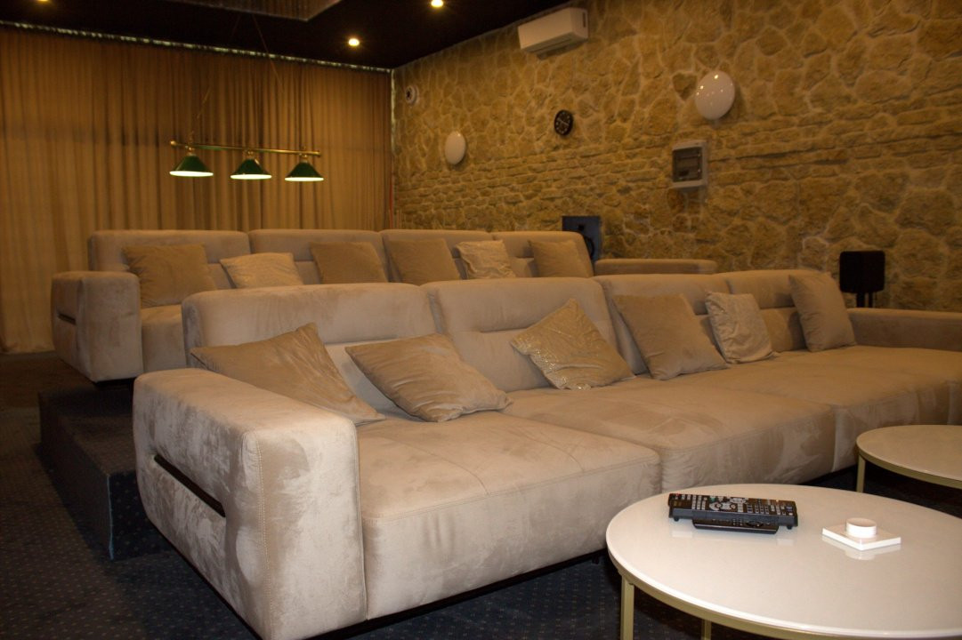 • Sală de cinema complet echipată (ecran 4K adus din SUA, sistem audio 7.1, subwoofer, stație cu Alexa, efect „cer înstelat” cu senzor, izolație fonică, canapele pe comandă din Italia)