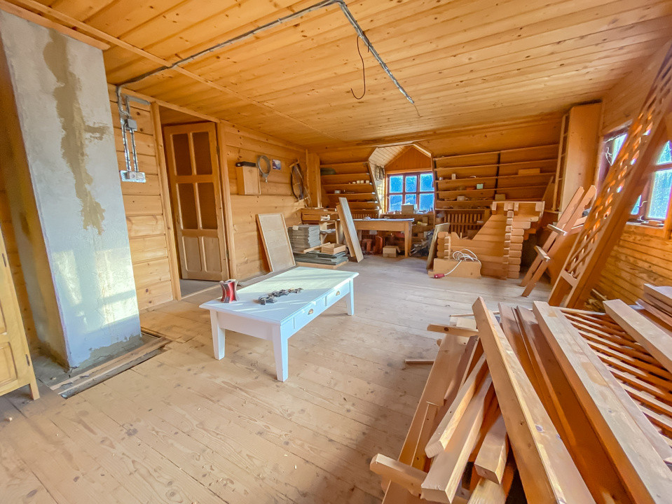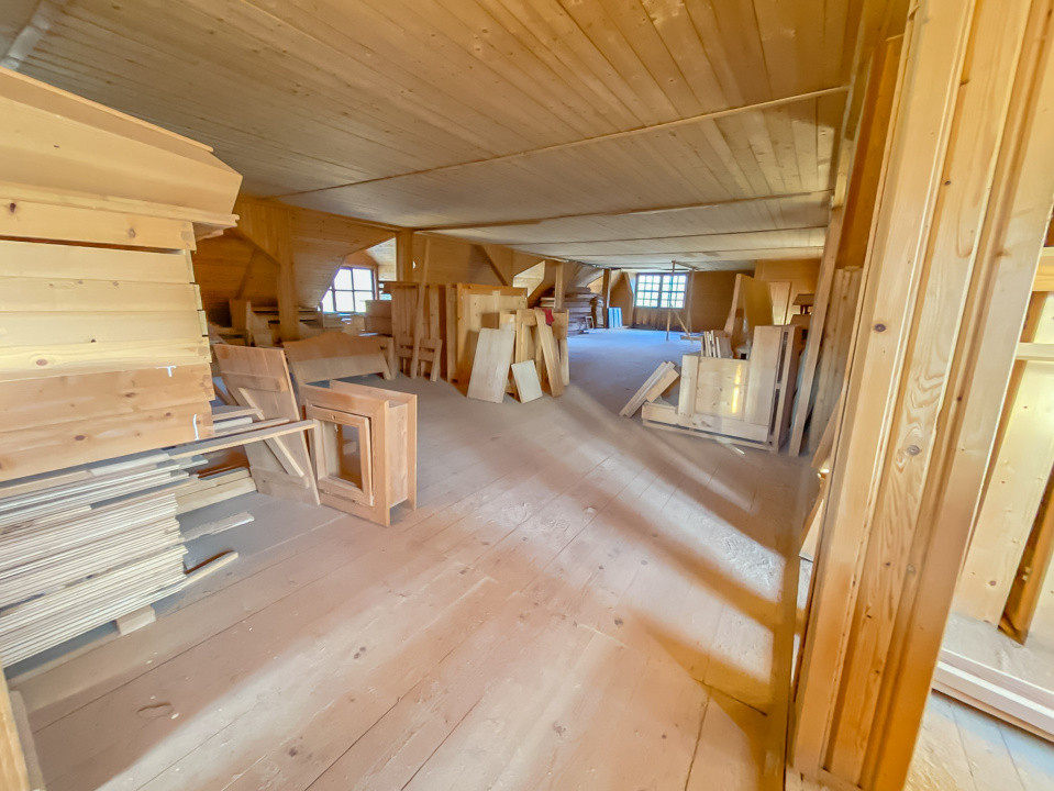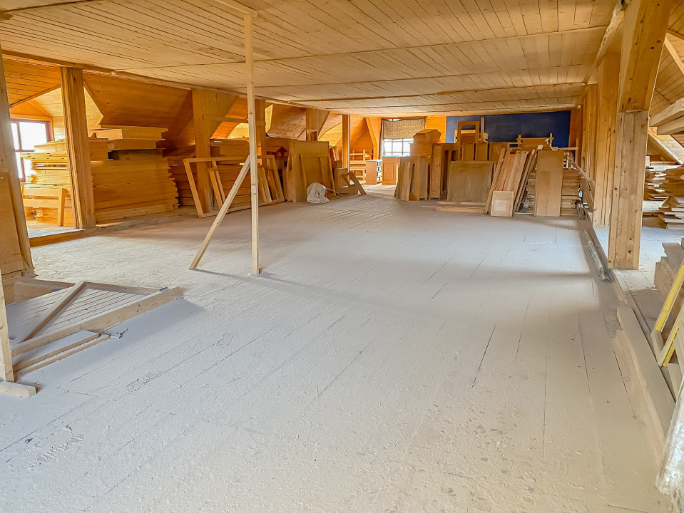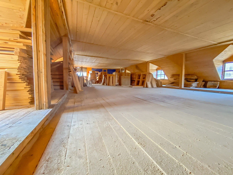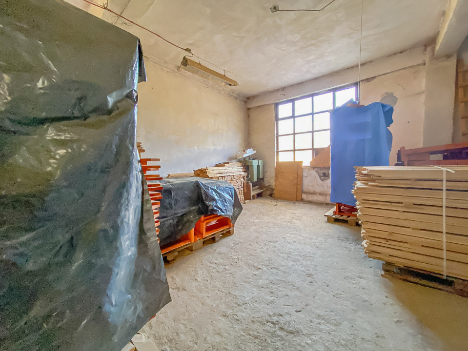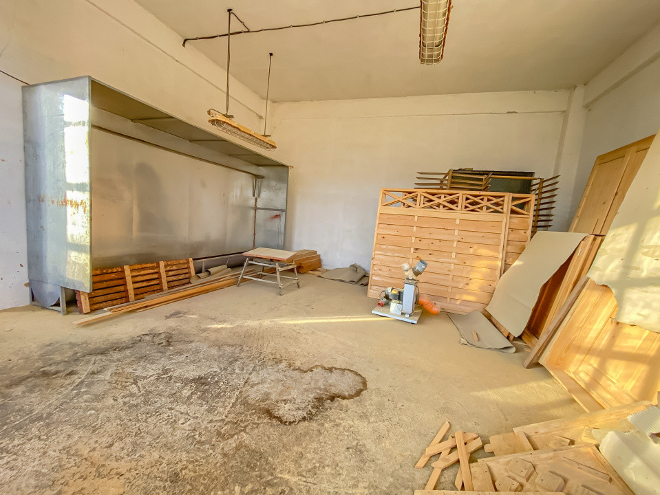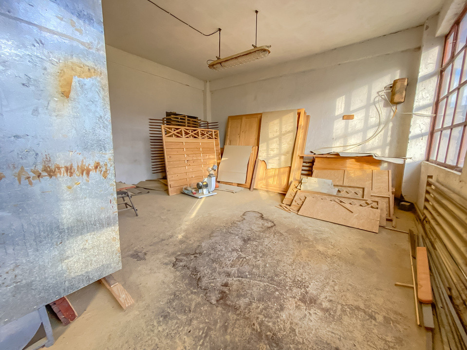 Atelier dispus pe două nivele (parter + etaj) și mansardă spațioasă, cu acces facil, ideală pentru depozitare.